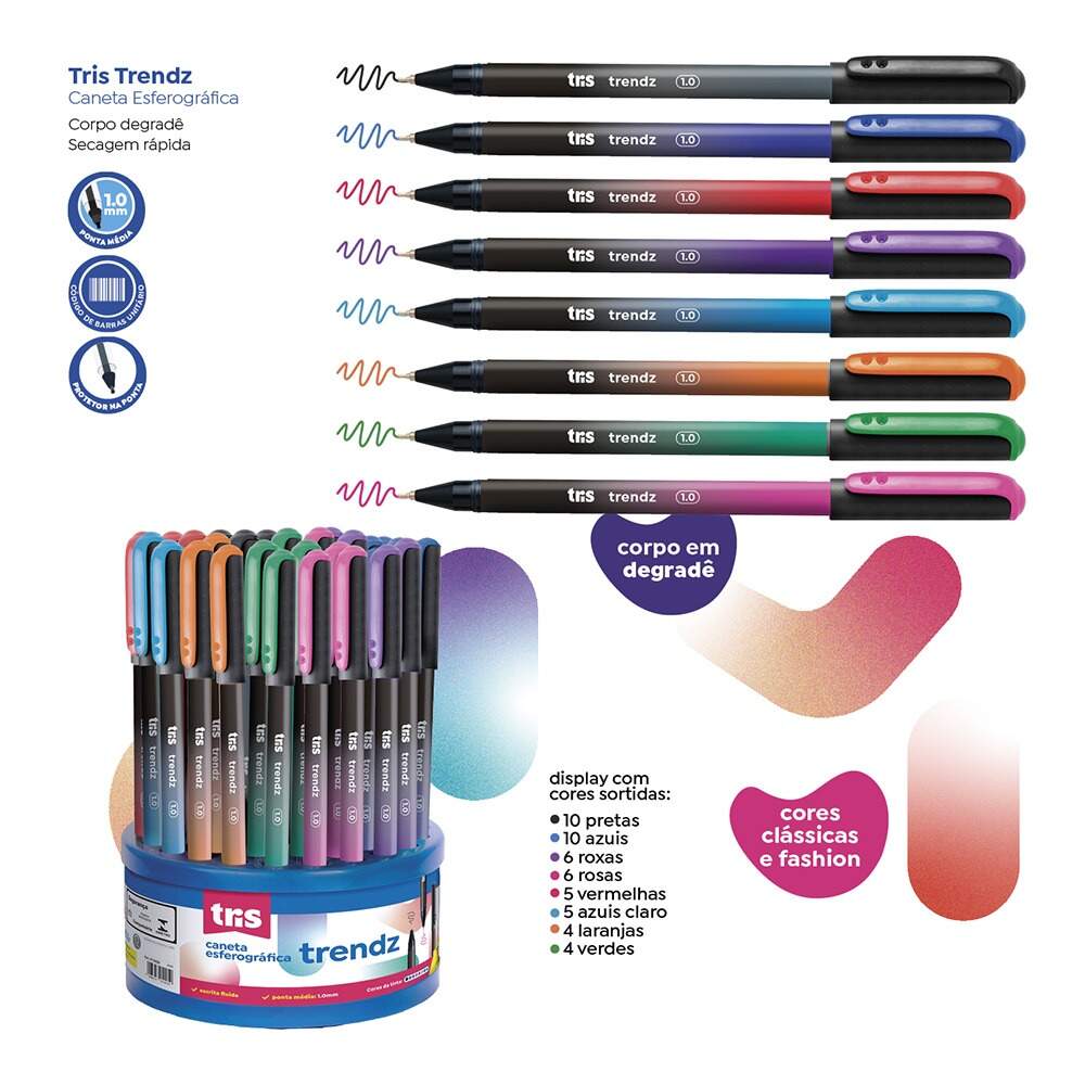 Caneta Tris Trendz Caneta Tris Trendz Referência: 00051451 Modelo/Marca: Tris R$ 6,90 R$ 6,56 à vista ou em até 1x de R$ 6,90 no cartão Comprar Esse produto encontra-se indisponível. Deixe seu contato que avisaremos quando chegar. Seu nome: Seu e-mail: Desejo receber e-mails com lançamentos e promoções. Avise-me quando disponível R$ 6,56 à vista com 5% de desconto Boleto Bancário R$ 6,56 à vista com 5% de desconto Parcelas 1x de R$ 6,90 sem juros Indicar este produto Deixar comentário Marca: TrisNome do produto: Caneta Esferográfica Tris Trendz (ColorMix Trend)Referência: Ex: 905116 (versão 0,7¿¿¿mm retrátil); displays com múltiplas unidades também disponíveisFormato: Retrátil (click), corpo degradê com cores vibrantesDimensões: Aproximadamente 14 cm de comprimentoMaterial: Corpo em plástico (resina termoplástica) com grip próximo à pontaCor predominante: Degradê em tons modernos (rosa, lilás, turquesa, azul); corpo combina com cores da tintaCompartimentos: Mecanismo retrátil com clip integradoPonta: Fina ¿¿¿ 0,7¿¿¿mmTinta: Esferográfica em 4 cores (rosa, roxo, turquesa, azul), fluida e maciaDestaques:Lavação com quatro cores em um único corpo retrátilEscrita suave e precisa com ponta finaVisual degradê moderno com grip para confortoIdeal para anotações coloridas, estudos ou uso criativoProduto certificado pelo INMETRO (registro OCP)SKU - 00051451Ref. Fabricante - 910059Inmetro - 000335/2018EAN / GTIN - 7908673911780