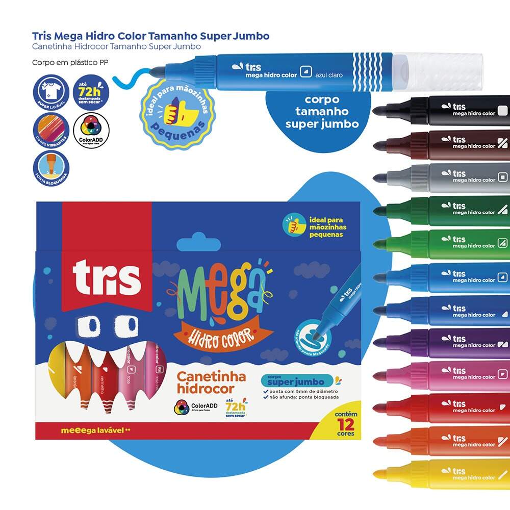 Hidrocor Tris Mega Super Jumbo 12 Cores Hidrocor Tris Mega Super Jumbo 12 Cores Referência: 00051506 Modelo/Marca: Tris R$ 44,90 ou em até 1x de R$ 44,90 no cartão ou R$ 42,66 à vista com 5% de desconto COMPRAR Esse produto encontra-se indisponível. Deixe seu contato que avisaremos quando chegar. Seu nome: Seu e-mail: Desejo receber e-mails com lançamentos e promoções. Avise-me quando disponível Confira formas de pagamento X R$ 42,66 à vista com 5% de desconto Boleto Bancário R$ 42,66 à vista com 5% de desconto Parcelas 1x de R$ 44,90 Marca: TrisNome do produto: Canetinha Mega Hidro Color ¿¿¿ Super¿¿¿Jumbo (12 cores)Formato: Corpo e ponta grossa (aprox. 2,3 a 5,0¿¿¿mm), ponta bloqueada para maior durabilidadeQuantidade de cores: 12 cores ultra intensasComposição:Corpo em resina termoplásticaPonta em feltro bloqueadoTinta à base de água, lavável, com corantes e umectantesCaracterísticas técnicas:Ponta grossa ideal para áreas extensasPode ficar destampada por até 72 horas sem secar (cores claras)SKU - 00051506Ref Fabricante - 911223Inmetro - 004840/2025EAN / GTIN - 7908673911223