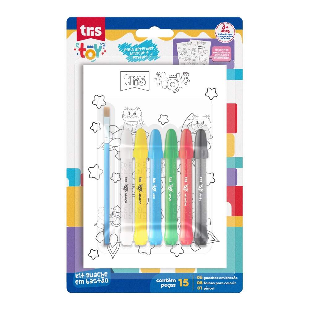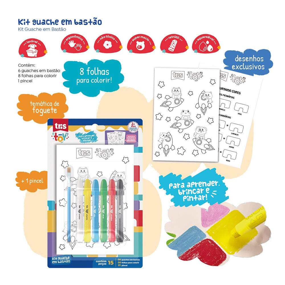 Kit Guache Bastão + Folhas c/15 Kit Guache Bastão + Folhas c/15 Referência: 00051510 Modelo/Marca: Tris R$ 34,90 R$ 33,16 à vista ou em até 1x de R$ 34,90 no cartão Comprar Esse produto encontra-se indisponível. Deixe seu contato que avisaremos quando chegar. Seu nome: Seu e-mail: Desejo receber e-mails com lançamentos e promoções. Avise-me quando disponível R$ 33,16 à vista com 5% de desconto Boleto Bancário R$ 33,16 à vista com 5% de desconto Parcelas 1x de R$ 34,90 sem juros Indicar este produto Deixar comentário Kit Guache Bastão + Folhas c/15A linha Tris Toy cria memórias especiais através de brincadeiras que exp loram incríveis descobertas. Um mundo repleto de alegria, diversão e ima ginação.O Kit Guache em Bastão é super completo para aprender, brincar e pintar. São 6 cores de guache em bastão, que possuem corpo retrátil, são super macios, aquareláveis e laváveis. O kit também é composto por 8 folhas para colorir, com desenhos exclusivos na temática de foguetes, e que auxiliam na aprendizagem, além de vir acompanhado do pincel, torn ando o aprender e brincar super práticos.SKU - 00051510Ref. Fabricante - 911117Inmetro - 003669/2025EAN / GTIN - 7908673911117