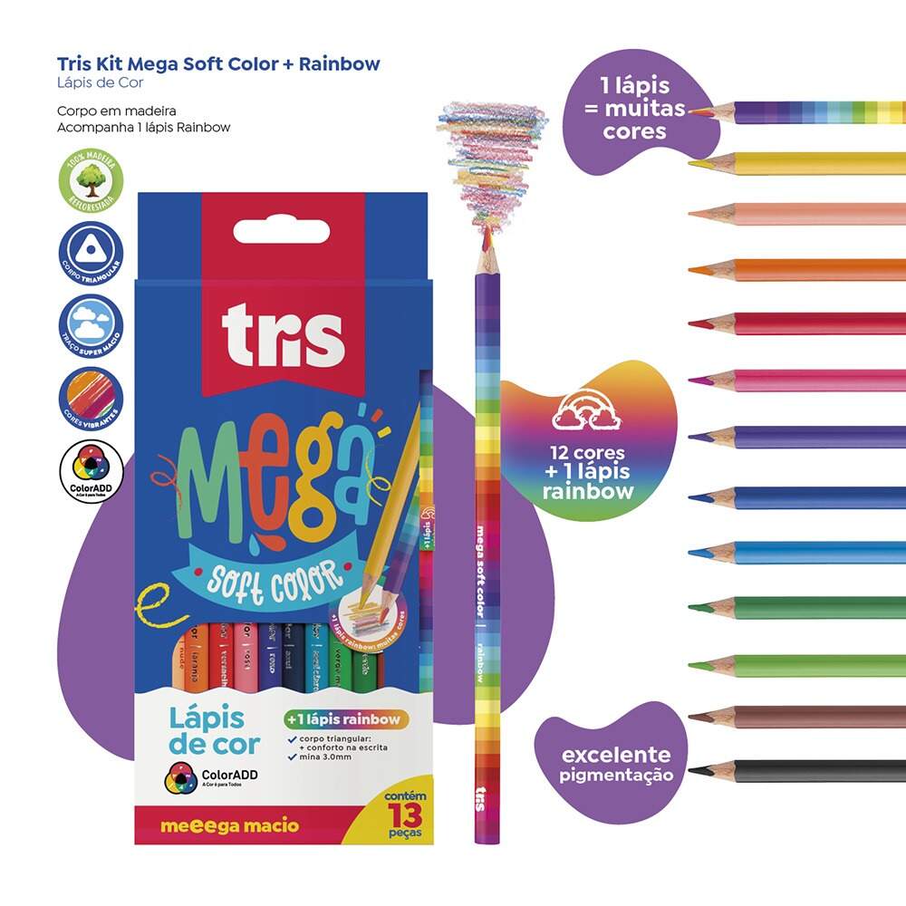 Lápis de Cor Tris Mega 12 Cores + Rainbow Lápis de Cor Tris Mega 12 Cores + Rainbow Referência: 00051518 Modelo/Marca: Tris R$ 19,90 R$ 18,91 à vista ou em até 1x de R$ 19,90 no cartão Comprar Esse produto encontra-se indisponível. Deixe seu contato que avisaremos quando chegar. Seu nome: Seu e-mail: Desejo receber e-mails com lançamentos e promoções. Avise-me quando disponível R$ 18,91 à vista com 5% de desconto Boleto Bancário R$ 18,91 à vista com 5% de desconto Parcelas 1x de R$ 19,90 sem juros Indicar este produto Deixar comentário Marca: TrisNome do produto: Kit Lápis de Cor Mega 12 Cores + RainbowReferência: (não especificada)Formato: Estojo com 12 lápis de cor + 1 lápis colorido RainbowDimensões: Aproximadamente 17 cm (comprimento dos lápis)Material: Madeira, pigmentos atóxicosCor predominante: Cores sortidas + lápis Rainbow multicoloridoCompartimentos: Embalagem com 13 unidades (12 lápis tradicionais + 1 lápis Rainbow)Destaques:Lápis de cor com cores vibrantes e cobertura intensaInclui lápis Rainbow com ponta multicolorida que cria efeito especial ao colorirProduto atóxico, seguro para criançasIdeal para uso escolar e artísticoFormato ergonômico que facilita a pegada e o manuseioSKU - 00051518Ref. Fabricante - 910936Inmetro - 001964/2018EAN / GTIN - 7908673910936