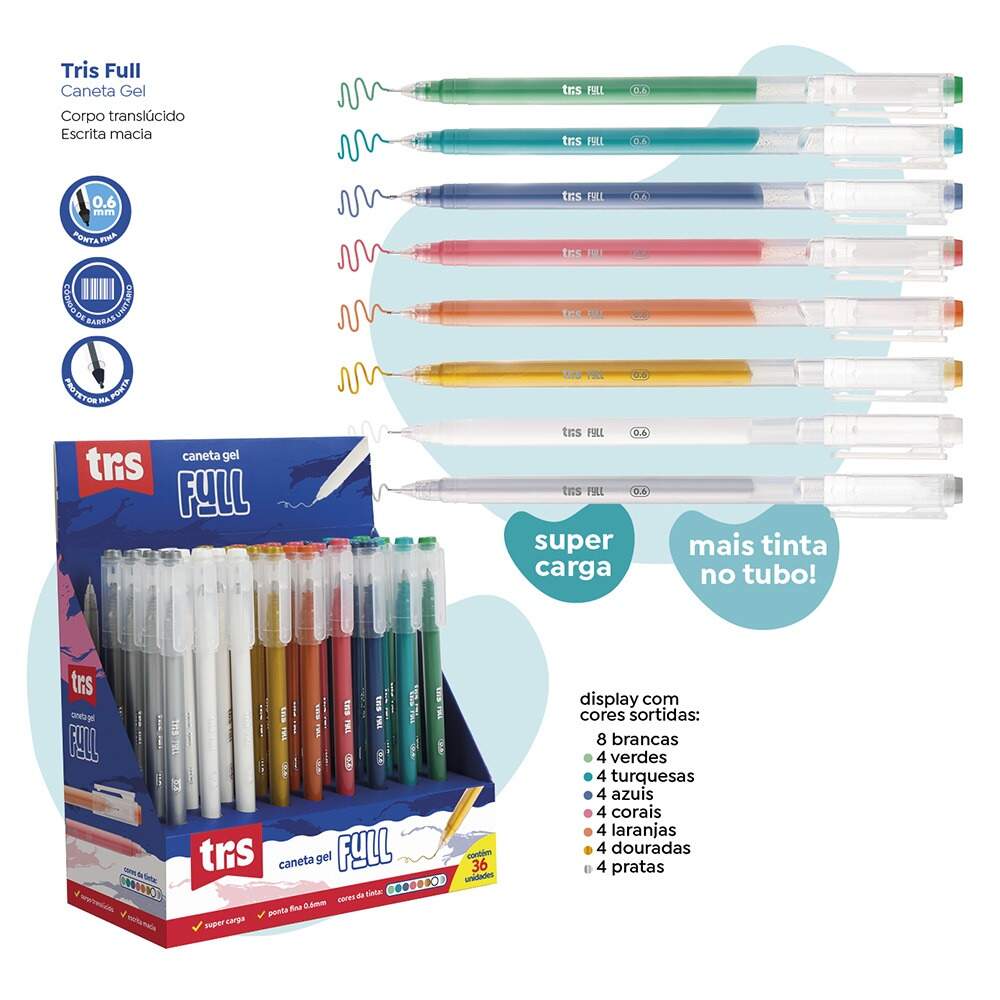 Tris - Caneta Gel Tris Full Caneta Gel Tris Full Referência: 00051427 Modelo/Marca: Tris R$ 9,90 R$ 9,41 à vista ou em até 1x de R$ 9,90 no cartão Comprar Esse produto encontra-se indisponível. Deixe seu contato que avisaremos quando chegar. Seu nome: Seu e-mail: Desejo receber e-mails com lançamentos e promoções. Avise-me quando disponível R$ 9,41 à vista com 5% de desconto Boleto Bancário R$ 9,41 à vista com 5% de desconto Parcelas 1x de R$ 9,90 sem juros Indicar este produto Deixar comentário Marca: TrisNome do produto: Caneta Gel Tris FullLinha/Modelo: InkfinityFormato: Caneta esferográfica com corpo transparente e grip emborrachadoPonta: 1,0 mmMaterial: Corpo em plástico resistente com tinta gel à base de corantes, solventes e metalCores da tinta: Sortidas incluindo cores metálicas, pastel e glitterSKU - 00051427Ref. Fabricante - 911292Inmetro - 003138/2025EAN / GTIN - 7908673912480